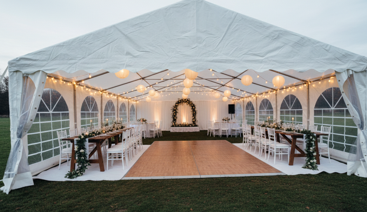 Perfekt für große Feiern wie Hochzeiten oder Firmenfeiern: geräumig, wetter- und feuerfest und mit viel Tageslicht für eine fröhliche Atmosphäre.